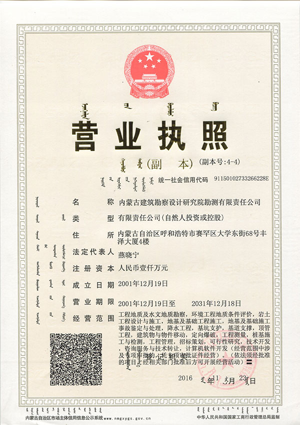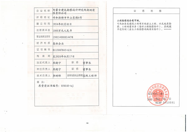 • 內(nèi)蒙古建筑勘察設(shè)計(jì)研究院勘測(cè)有限責(zé)任公司,是全國(guó)首家完成 轉(zhuǎn)企建制的省級(jí)建筑勘察設(shè)計(jì)單位。公司前身為內(nèi)蒙古建筑勘察 設(shè)計(jì)研究院勘測(cè)分院, 成立于1954年 ,經(jīng)過六十多年的發(fā)展, 現(xiàn)已成為全區(qū)技術(shù)力量雄厚、專業(yè)設(shè)置齊全的集巖土工程勘察 、 設(shè)計(jì)、治理、檢測(cè)、監(jiān)理、咨詢、水文地質(zhì)勘查、工程測(cè)量、科 研為一體的綜合性企業(yè) ... ... [查看詳情]